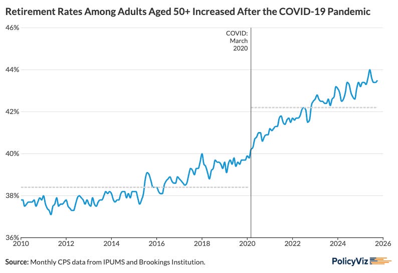 The share of people 50 years old and over who are retired shot up after the pandemic. There’s some interesting sample weighting issues at play in the estimation here; if you’re really interested, check out this report from the Brookings Institution.